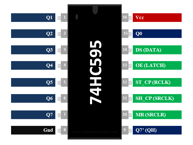 O 74HC595 é um Circuito Registrador de Deslocamento (Shift Register) de 8 bits serial-in que pode ser usado para controlar até 8 saídas simultâneas.